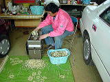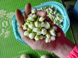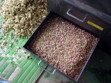 花が開花する前の状態が1番の適期です。 梨の花を摘んで脱こく機によるオシベを 取り出す作業です。↑ブログに掲載 |
