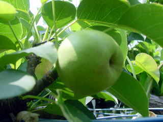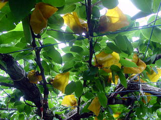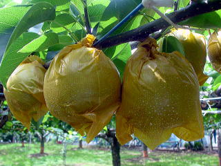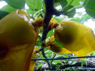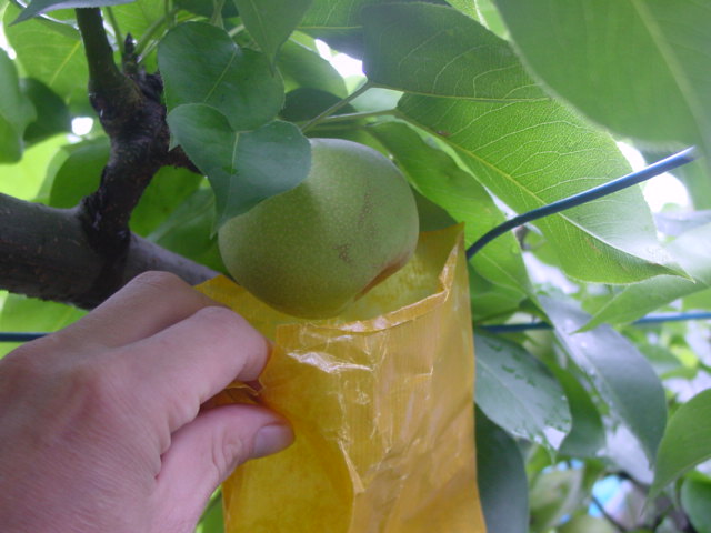 果実に袋をかけないと、青梨の肌の色がつかない為