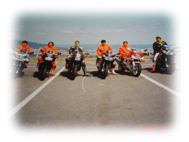 (黒とシルバーの皮つなぎ、首に黄色のサポーター)が私です。