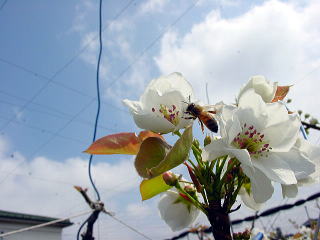 我が梨園では、柴蜂養蜂の蜜蜂で受粉作業を手伝ってもらっています。