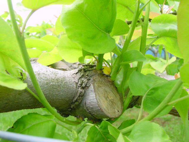 豊水の枝を切り、かおり梨の枝を接木して果実を育てます。